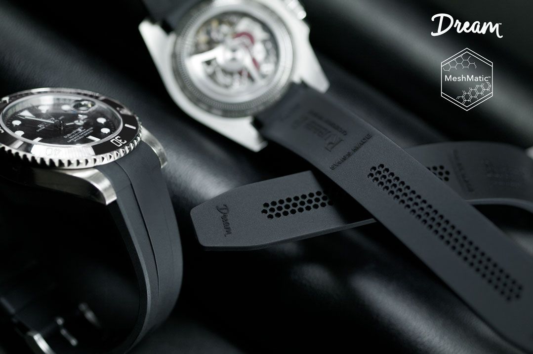 This supple vulanized rubber strap is specifically calibrated to fit all Rolex GMT Master II models (except cermaic bezel models)*. The Dream Strap features our PATENT-PENDING MeshMatic Technology for a perfectly precise and comfortable fit to your wrist. This strap utilizes "Blocked Integration" engineering, incorporating solid inserts for a flawless, motion-free flush mount to the GMT Master (non-ceramic) case, and features the Rubber B signature "T" design.
